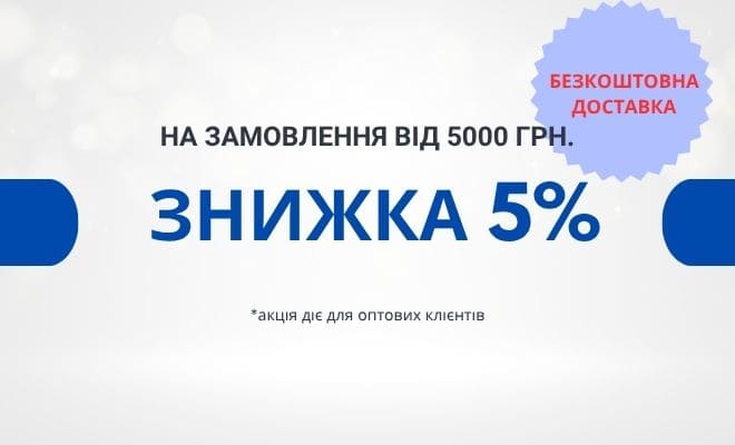 На всі гуртові замовлення від 5.000 грн. діє знижка 5% та безкоштовна доставка.